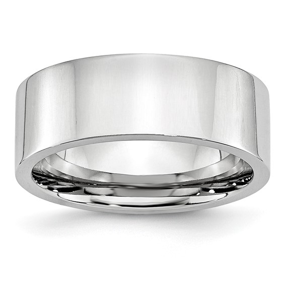 Comfort fit cobalt wedding band is 8mm wide. Flat, polished center. Made of cobalt chromium. Enjoy our limited lifetime warranty. About Cobalt ChromiumCobalt chromium is a bright white alternative metal. It is as white as platinum, hypoallergenic, shatterproof and highly scratch resistant. Cobalt rings will not chip or crack.