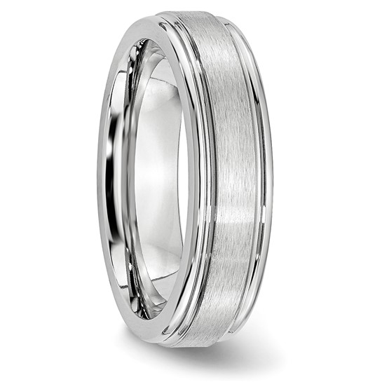 Comfort fit cobalt ring features a flat satin center and polished grooved edges. Width: 6mm. Made of cobalt chromium. Enjoy our limited lifetime warranty. Imported.About Cobalt ChromiumCobalt chromium is a bright white alternative metal. It is as white as platinum, hypoallergenic, shatterproof and highly scratch resistant. Cobalt rings will not chip or crack.