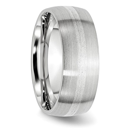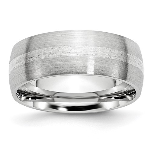 Comfort fit cobalt ring is 8mm wide. Satin finish, domed center with sterling silver inlay. Made of cobalt chromium. Enjoy our limited lifetime warranty. About Cobalt ChromiumCobalt chromium is a bright white alternative metal. It is as white as platinum, hypoallergenic, shatterproof and highly scratch resistant. Cobalt rings will not chip or crack.