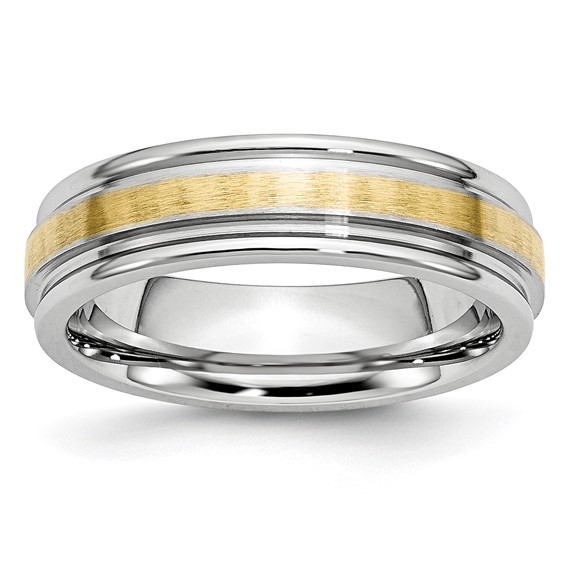 Comfort fit band is 6mm wide. Flat satin center with 14kt yellow gold inlay. Polished grooved edges. Made of cobalt chromium. Enjoy our limited lifetime warranty. About Cobalt ChromiumCobalt chromium is a bright white alternative metal. It is as white as platinum, hypoallergenic, shatterproof and highly scratch resistant. Cobalt rings will not chip or crack.
