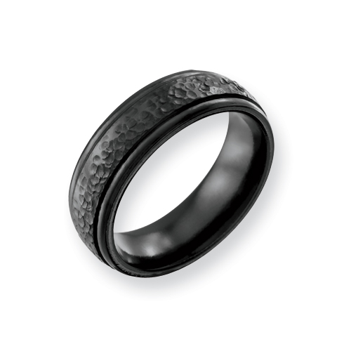 Black titanium, comfort fit wedding band has ridged edges. Hammered, brushed finish and domed center. Width: 7mm. Made of black Ti™. Enjoy our limited lifetime warranty. About Black Ti™Each ring in the Black Ti™ collection possesses the same benefit as gray titanium. Black Ti™ is the only non-coated, completely nickel-free and inert titanium alloy that can be processed to black. Black Ti™ was created through extensive research and development in blending titanium with other strategic elements.Black Ti™ is a proprietary alloy which miraculously experiences an atomic transformation at the molecular level to become ceramic, turning the titanium black from the outside in by exposing the element to extreme heat. The severe hardness created through this unique process yields a supremely scratch resistant surface.