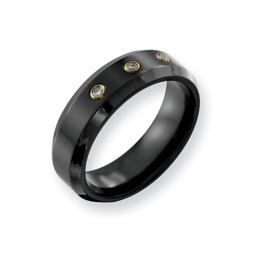 Black titanium, comfort fit band features three round diamond accents, .09 ct tw. Diamond details: I1 clarity, G-H color. Beveled edges. Polished finish. Width: 7mm. Made of black Ti™. Enjoy our limited lifetime warranty. About Black Ti™Each ring in the Black Ti™ collection possesses the same benefit as gray titanium. Black Ti™ is the only non-coated, completely nickel-free and inert titanium alloy that can be processed to black. Black Ti™ was created through extensive research and development in blending titanium with other strategic elements.Black Ti™ is a proprietary alloy which miraculously experiences an atomic transformation at the molecular level to become ceramic, turning the titanium black from the outside in by exposing the element to extreme heat. The severe hardness created through this unique process yields a supremely scratch resistant surface.