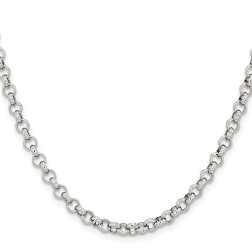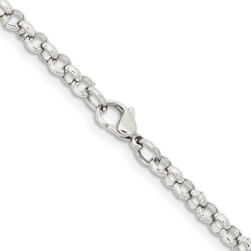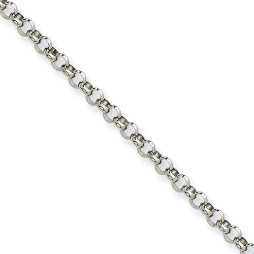 Polished steel rolo chain dimensions: 4.6mm wide links, 24in length. Fancy lobster clasp. Weight: 15.35 grams. This rolo chain is composed of grade 316 stainless steel, known for its superior corrosion resistance. Imported.