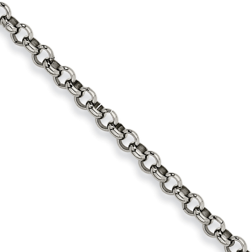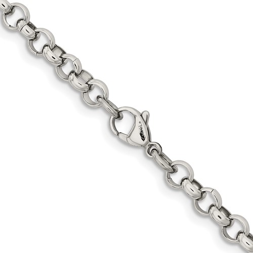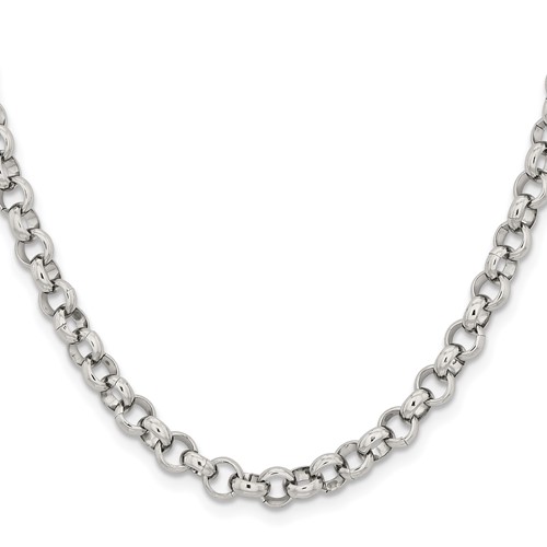 Polished steel rolo chain dimensions: 6.0mm wide links, 18in length. Link thickness: 1.0mm. Fancy lobster clasp. Weight: 22.5 grams. This rolo chain is composed of grade 316 stainless steel, known for its superior corrosion resistance. Imported.