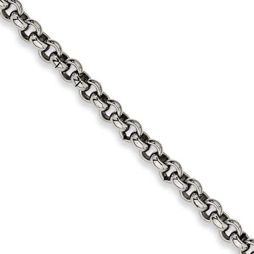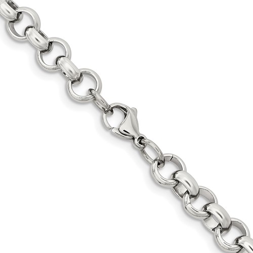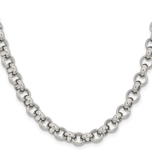 Polished steel rolo chain dimensions: 8.0mm wide links, 24in length. Link thickness: 1.3mm. Fancy lobster clasp. Weight: 57.1 grams. This rolo chain is composed of grade 316 stainless steel, known for its superior corrosion resistance. Imported.