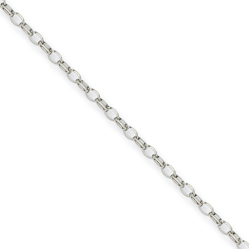 Polished steel cable chain dimensions: 3.2mm wide links, 20in length. Fancy lobster clasp. Weight: 3.44 grams. This cable chain is composed of grade 316 stainless steel, known for its superior corrosion resistance. Imported.