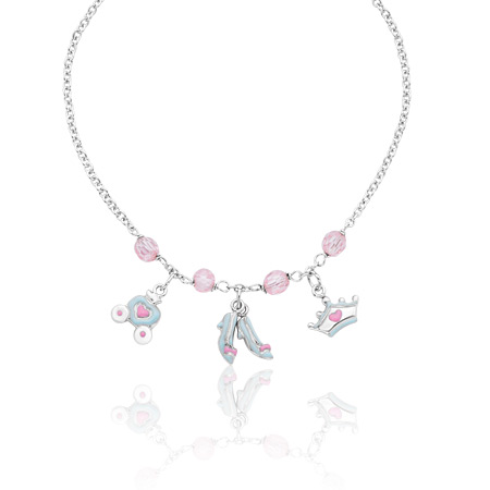 Made of sterling silver, this Cinderella necklace is part of the Disney Precious Collection. Hand-enameled slippers, tiara and pumpkin coach charms dangle. Four pink crystals adorn the necklace. Adjustable necklace length grows with your daughter, from 13in, 14in to 15in. Fancy lobster clasp. Includes free Disney keepsake storybook box.1-Year Limited WarrantyDisney Precious Collection jewelry is meticulously designed to embody the heart of Disney. Therefore, to avoid any broken hearts, the manufacturer offers a warranty on the entire collection against damage during normal wear for one year from date of purchase.