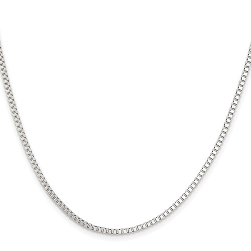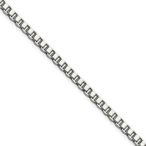 Polished steel box chain dimensions: 2.0mm wide links, 20in length. Fancy lobster clasp. Weight: 7.11 grams. This box chain is composed of grade 316 stainless steel, known for its superior corrosion resistance. Imported.