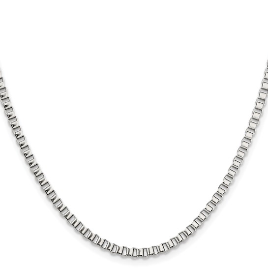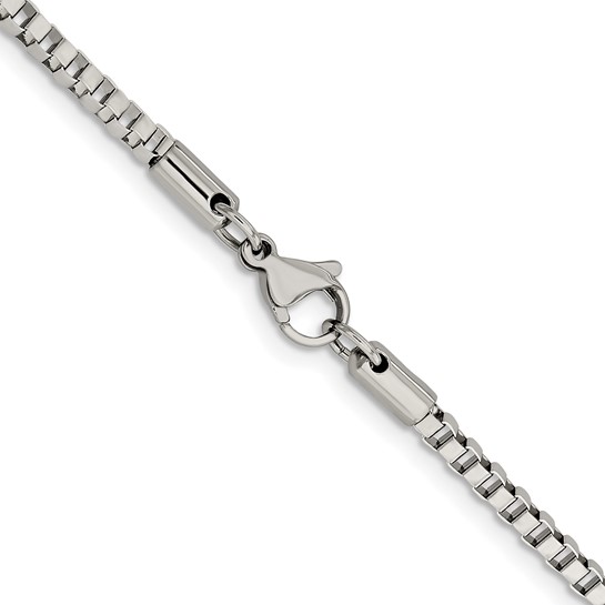Polished steel box chain dimensions: 3.2mm wide links, 30in length. Fancy lobster clasp. Weight: 22.27 grams. This box chain is composed of grade 316 stainless steel, known for its superior corrosion resistance. Imported.
