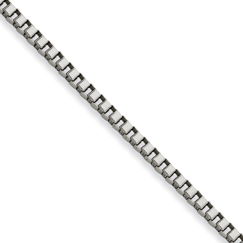 Polished steel box chain dimensions: 4.0mm wide links, 24in length. Fancy lobster clasp. Weight: 25.25 grams. This box chain is composed of grade 316 stainless steel, known for its superior corrosion resistance. Imported.