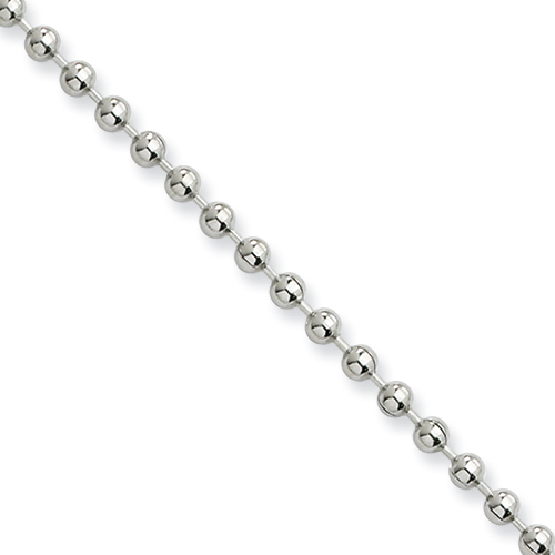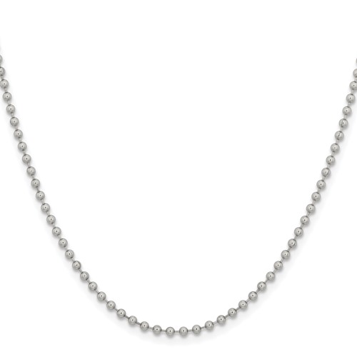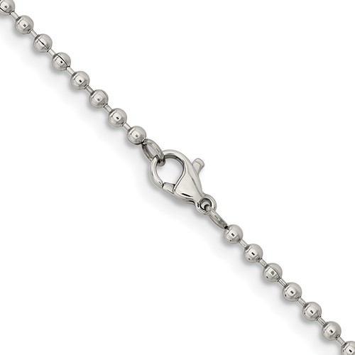 Polished steel bead chain dimensions: 2.4mm wide, 22in length. Fancy lobster clasp. Weight: 5.71 grams. This bead chain is composed of grade 316 stainless steel, known for its superior corrosion resistance. Imported.