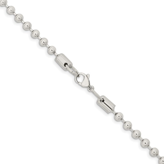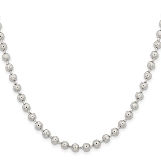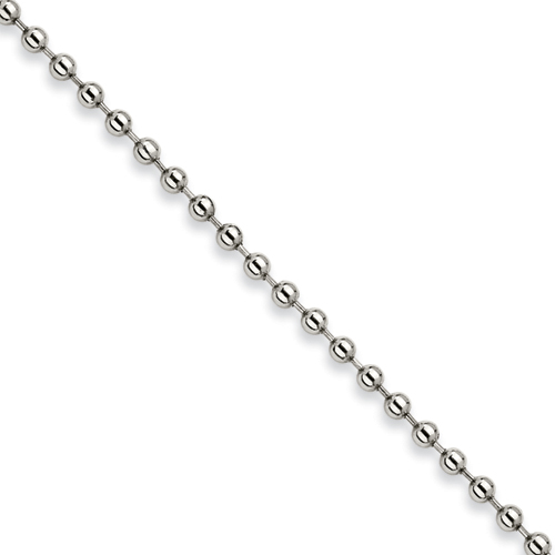 Polished steel bead chain dimensions: 5.0mm wide, 22in length. Fancy lobster clasp. Weight: 20.2 grams. This bead chain is composed of grade 316 stainless steel, known for its superior corrosion resistance. Imported.