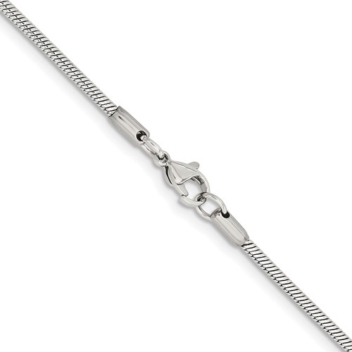 Stainless steel 24in snake chain has a fancy lobster clasp. Chain width: 2mm. Weight: 4.98 grams. This snake chain is composed of grade 316 stainless steel, known for its superior corrosion resistance. Imported.