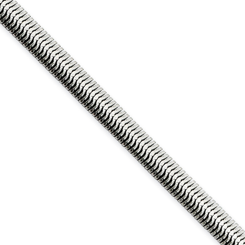 Polished steel snake chain dimensions: 4.2mm wide, 20in length. Fancy lobster clasp. Weight: 11.27 grams. This snake chain is composed of grade 316 stainless steel, known for its superior corrosion resistance. Imported.
