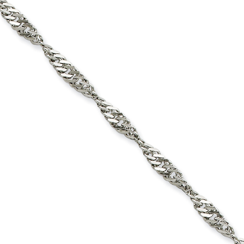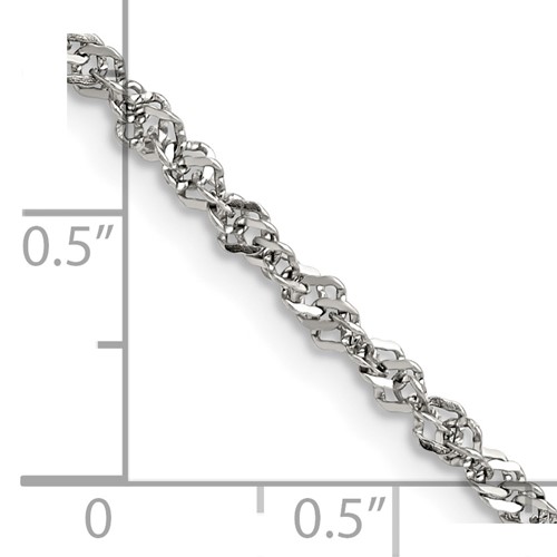 Steel singapore chain dimensions: 3.0mm wide, 24in length. Fancy lobster clasp. Weight: 5.84 grams. This singapore chain is composed of grade 316 stainless steel, known for its superior corrosion resistance. Imported.