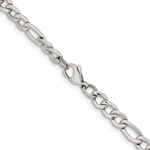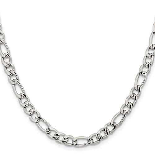 Steel figaro chain dimensions: 6.3mm wide, 22in length. Fancy lobster clasp. Weight: 26.95 grams. This figaro chain is composed of grade 316 stainless steel, known for its superior corrosion resistance. Imported.