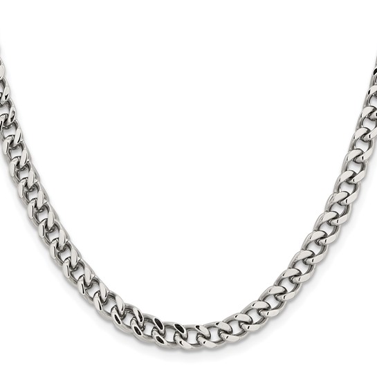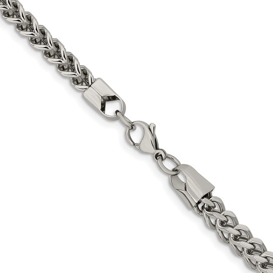 Steel franco chain dimensions: 5.5mm wide, 22in length. Fancy lobster clasp. Weight: 44.22 grams. This franco chain is composed of grade 316 stainless steel, known for its superior corrosion resistance. Imported.