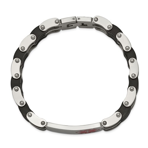 Polished, stainless steel medical bracelet features solid red cross and caduceus symbol on engravable plate. Black rubber accents. 1/2in wide links, bracelet is 8 1/2 inches in length. Engravable upon request. All medical jewelry engravings are custom engraved on the back of the piece unless otherwise specified.This bracelet is composed of grade 316 stainless steel, known for its superior corrosion resistance. 316 steel is commonly used in stainless steel jewelry. Stainless steel will not oxidize [rust] nor turn black. Imported.