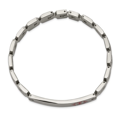 Polished, stainless steel medical bracelet features outlined red cross and caduceus symbol on left side of engravable plate. 3/8in wide links, bracelet is 8 inches in length. Engravable upon request. All medical jewelry engravings are custom engraved on the back of the piece unless otherwise specified.This bracelet is composed of grade 316 stainless steel, known for its superior corrosion resistance. 316 steel is commonly used in stainless steel jewelry. Stainless steel will not oxidize [rust] nor turn black. Imported.
