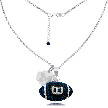 University of Michigan crystal football necklace features blue, black, and white Austrian crystals. Sterling silver 18in diamond cut cable chain and lobster clasp. Football dimensions: 17mm, slightly smaller than a dime. Officially licensed.