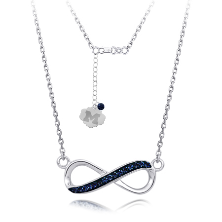 University of Michigan crystal infinity necklace features blue and white Austrian crystals. Sterling silver 18in diamond cut cable chain with lobster clasp. Infinity pendant dimensions: 28.5mm x 10mm, slightly wider than a quarter. Officially licensed.