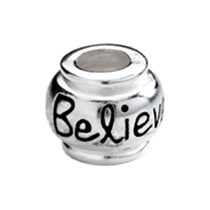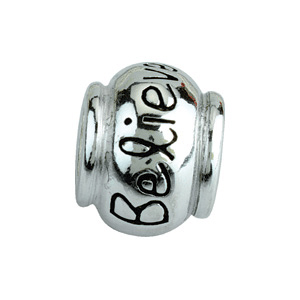 This small Believe bead is made of polished sterling silver. Dimensions: 10mm. Hole size 4.5mm. This Kera bead fits all major bead brands. Weight: 1.96 grams. Available while supplies last.