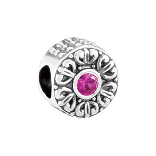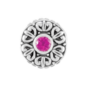 Kera sterling silver round floral bead has a 3.5mm round imitation ruby crystal. Dimensions: 7.30 X 10.55 MM. Weight: 3.78 grams.