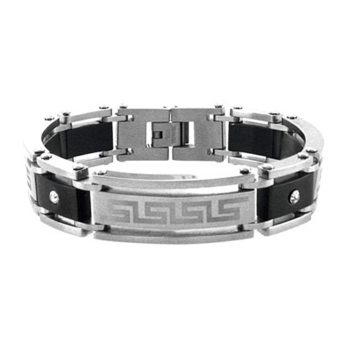 Greek key bracelet features two cubic zirconia accents. Alternating black ion plated links and polished stainless steel. This bracelet is composed of grade 316L stainless steel, known for its superior corrosion resistance. Nickel free. 316L steel is also known as marine grade stainless steel, for its high resistance to chloride corrosion. Stainless steel will not oxidize [rust] nor turn black. Imported.