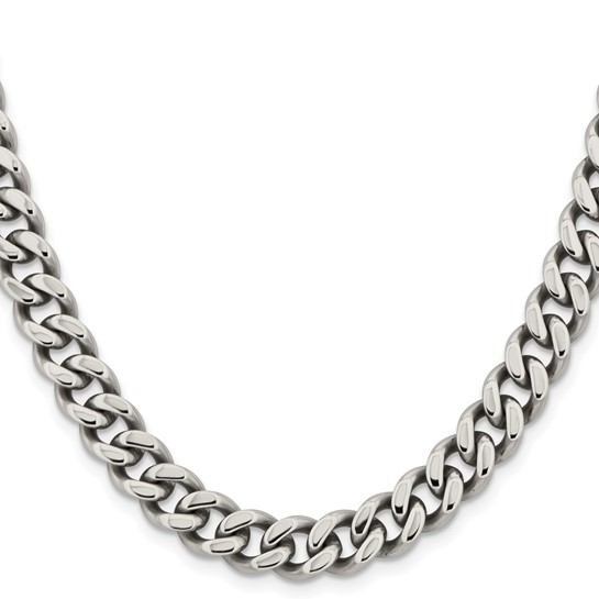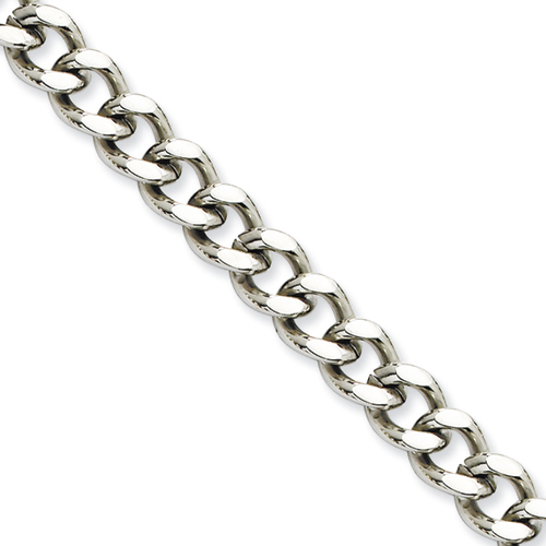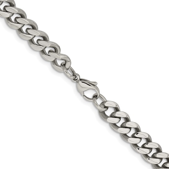 This wide polished curb chain is made of 316L stainless steel. Width: 9.5mm. Fancy lobster clasp. Length: 22in. Weight: 80.7 grams. Imported.