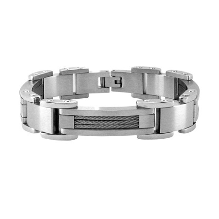Length: 8.5in. The top of the bracelet has three steel cables hidden in a longer link for comfort wear. This item is composed of grade 316L stainless steel, known for its superior corrosion resistance. Nickel free. 316L steel is also known as marine grade stainless steel, for its high resistance to chloride corrosion. Stainless steel will not oxidize [rust] nor turn black. Imported.