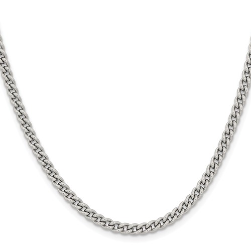 Polished, round curb chain is made of 316L stainless steel. Width: 4mm. Fancy lobster clasp. Length: 20in. Weight: 18.3 grams. Imported.