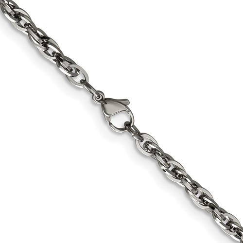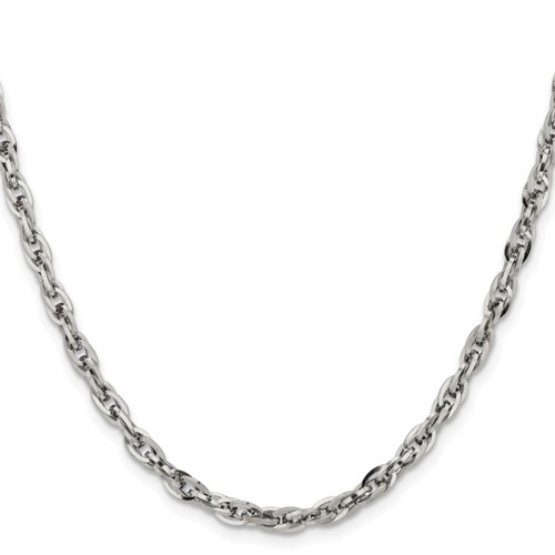 Polished twisted rope chain is made of 316L stainless steel. Width: 4.2mm. Fancy lobster clasp. Length: 22in. Weight: 15.0 grams. Imported.
