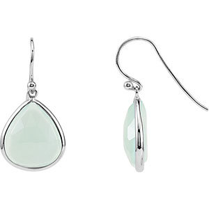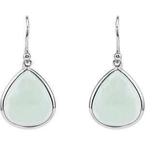 Genuine aqua blue chalcedony earrings are made of polished sterling silver. Each earring is set with a 16mm x 14mm pear shaped aqua blue chalcedony gemstone. 16 ct tw earrings. Shepherd hooks. Earring dimensions: 32mm x 15mm. Approximate weight: 2.05 grams.