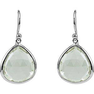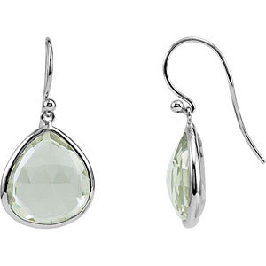 Genuine green quartz earrings are made of polished sterling silver. Each earring is set with a 16mm x 14mm pear shaped green quartz gemstone. 15 3/4 ct tw earrings. Shepherd hooks. Earring dimensions: 32mm x 15mm. Approximate weight: 2.05 grams.