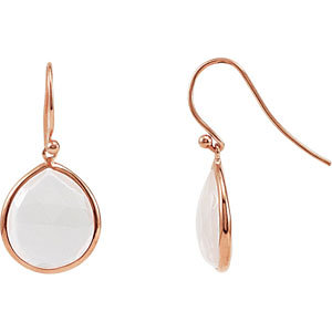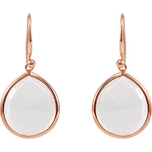Genuine rose quartz earrings are made of polished sterling silver with 14kt rose gold plating. Each earring is set with a 16mm x 14mm pear shaped rose quartz gemstone. 15 ct tw earrings. Shepherd hooks. Earring dimensions: 32mm x 15mm. Approximate weight: 2.05 grams.