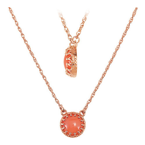 Polished 14kt rose gold necklace with 8mm round cabochon coral. Exquisite crown setting. 14kt rose gold rope chain length: 18in. Lobster clasp. Approximate weight: 2.4 grams.