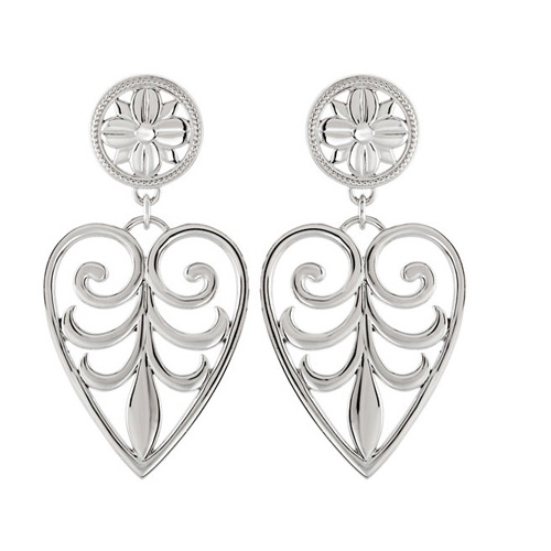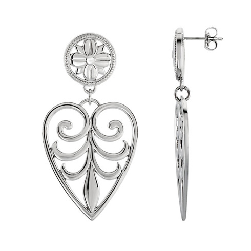 Polished sterling silver heart-shaped earrings feature floral accents. Approximate weight: 9.75 grams.