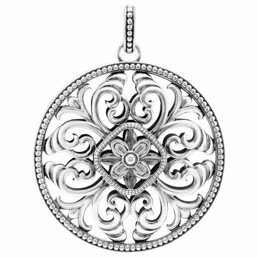 Designed by former Tiffany and Co. designer Galina Stoudenkina, this pendant features exquisite floral elements. Chain sold separately. Polished sterling silver. Dimensions: 59.2mm x 45.9mm. Approximate weight: 28 grams.