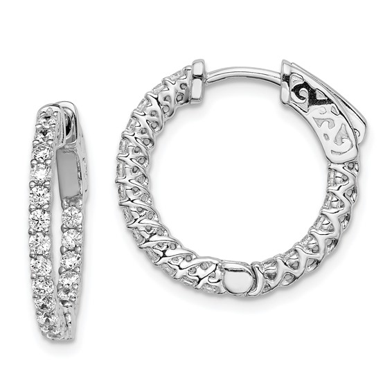 Polished sterling silver with rhodium plating. Diameter: 3/4in. Inside and out hoop earrings feature 38 x 1.7mm round brilliant cubic zirconias. Lucinda 2-prong, shared setting. Weight: 3.4 grams. Imported.