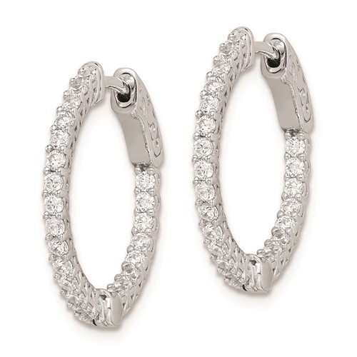 Polished sterling silver with rhodium plating. Diameter: 7/8in. Inside and out hoop earrings feature 46 x 1.7mm round brilliant cubic zirconias. Lucinda 2-prong, shared setting. Weight: 4.19 grams. Imported.