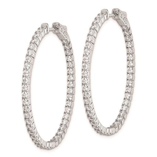 Polished sterling silver with rhodium plating. Inside and out hoop earrings feature 84 x 2.3mm round brilliant cubic zirconias. 4-prong, u-shape setting. Weight: 10.6 grams. Imported.