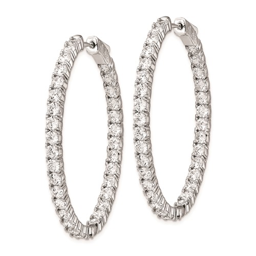 Polished sterling silver with rhodium plating. Inside and out hoop earrings feature 66 x 2.9mm round brilliant cubic zirconias. 4-prong, u-shape setting. Weight: 13.18 grams. Imported.