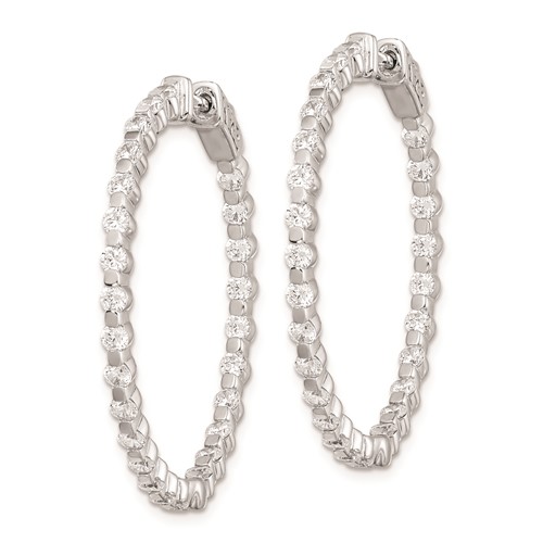 Sterling silver inside and out hoop earrings feature 52 x 2.3mm round brilliant cubic zirconias. 1-prong shared setting. Diameter: 1 1/4in. Post, notch and lock closure. Approximate weight: 8.18 grams. Imported.