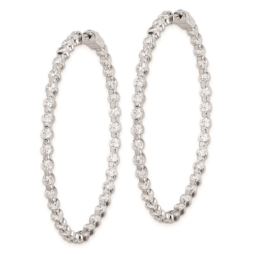 Sterling silver inside and out hoop earrings feature 70 x 2.7mm round brilliant cubic zirconias. 1-prong shared setting. Diameter: 2in. Polished sterling silver with rhodium plating. Weight: 11.5 grams. Imported.