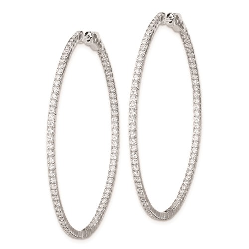 Polished sterling silver with rhodium plating. Diameter: 2in. Inside and out hoop earrings feature 160 x 1.1mm round brilliant cubic zirconias. 4-prong shared setting. Weight: 7 grams. Imported.