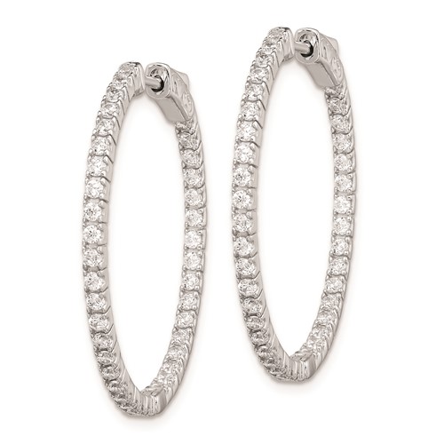 Polished sterling silver with rhodium plating. Diameter: 1 1/4in. Inside and out hoop earrings feature 76 x 1.6mm round brilliant cubic zirconias. 4-prong shared setting. Weight: 5.3 grams. Imported.