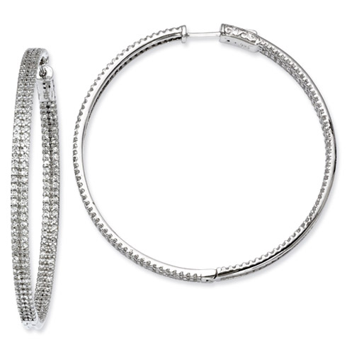 Polished sterling silver with rhodium plating. Diameter: 2in. Inside and out hoop earrings feature 400 x 1.2mm round brilliant cubic zirconias. Pavé setting. Weight: 14.85 grams. Imported.