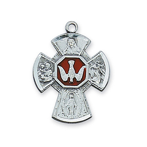 This four way medal necklace is made of polished sterling silver with red enamel. Dimensions: 3/4n in length not including jump ring. 18in rhodium-plated brass continuous chain (no clasp).