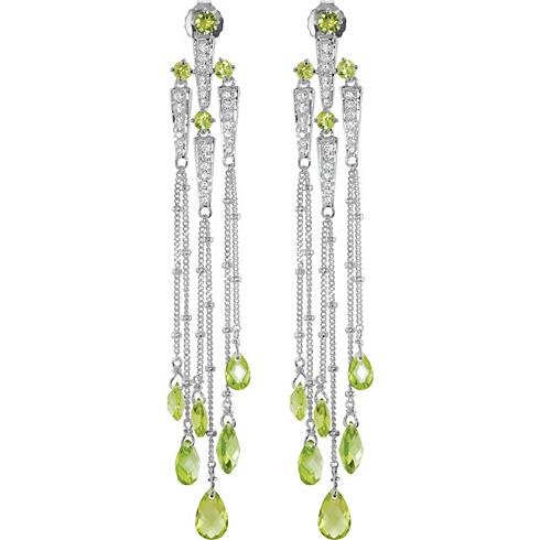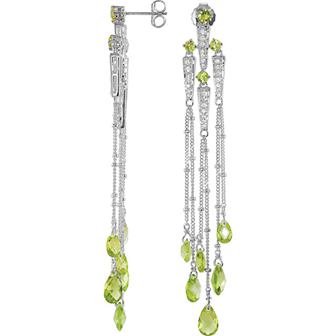 Polished sterling silver drop earrings feature round, pear and briolet shaped peridots with cubic zirconia accents. Earring length: 3in. Weight 5.44 grams.