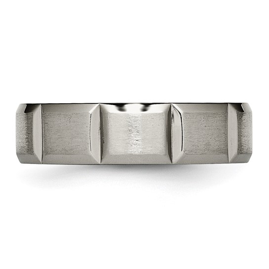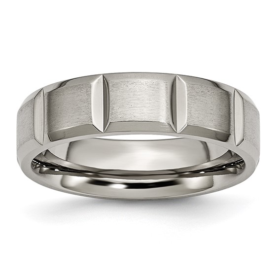Brushed panels are separated by polished notches on this 6mm titanium ring. This style is available in half and whole finger sizes, 6-13. Comfort fit ring is made of commercially pure titanium, grade 4 [CP 4]. Imported.